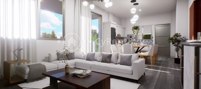 The apartment features a bright open-plan living and kitchen area, designed to maximize space and natural light. The kitchen also benefits from its own private balcony, adding extra practicality and ventilation.