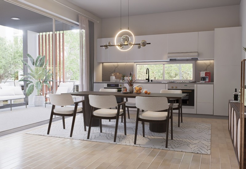 The apartment features a bright open-plan living and kitchen area, designed to maximize space and natural light. The kitchen also benefits from its own private balcony, adding extra practicality and ventilation.