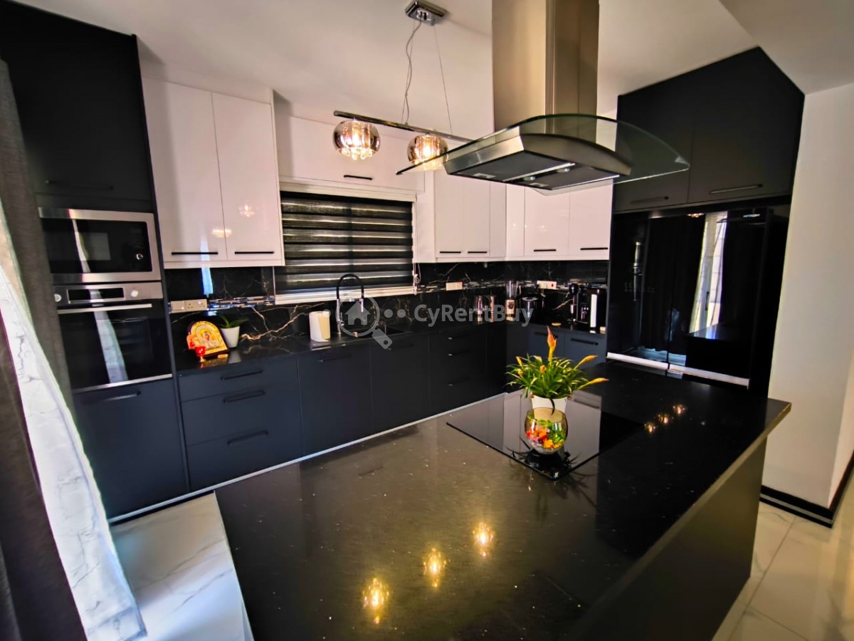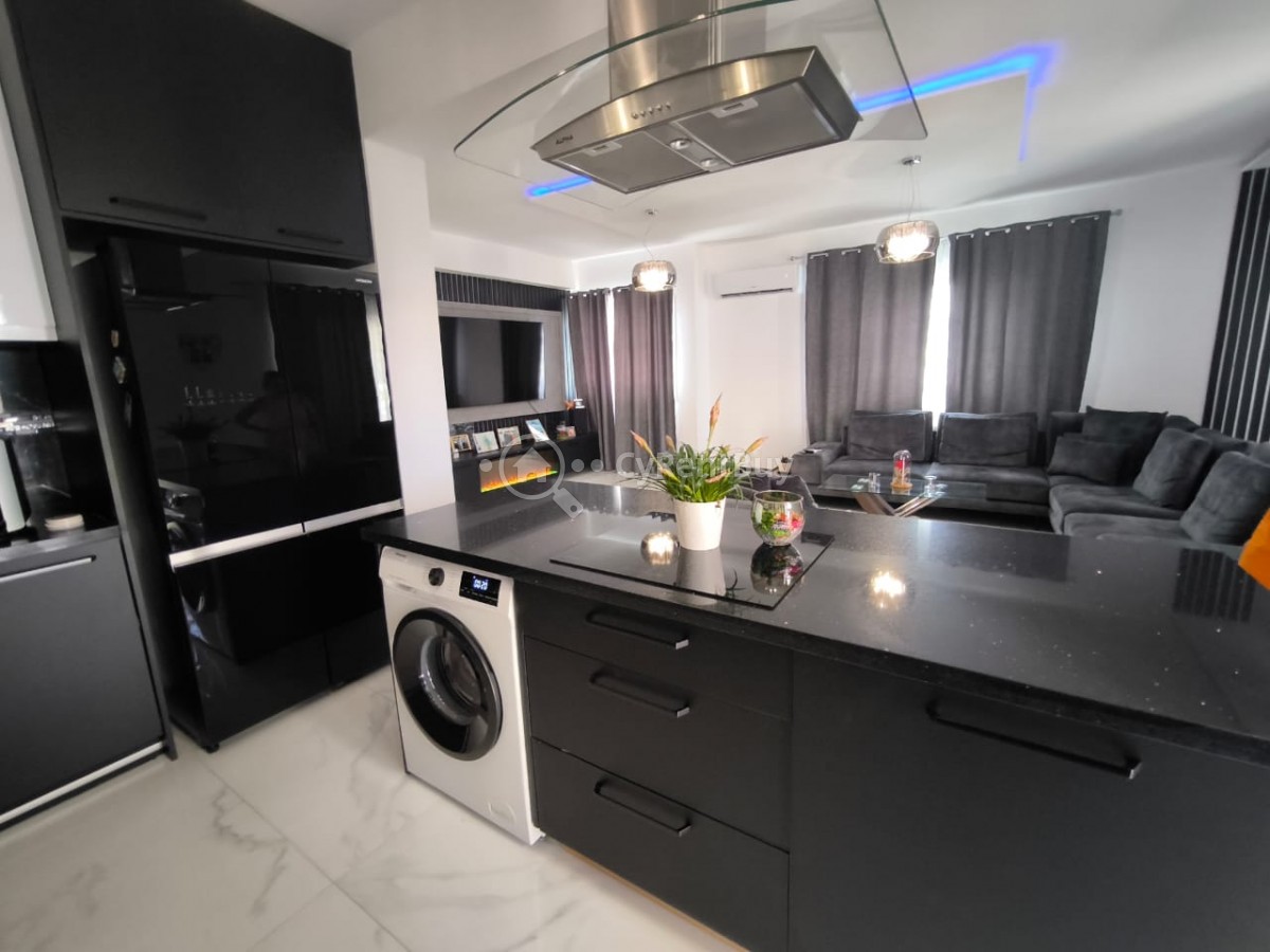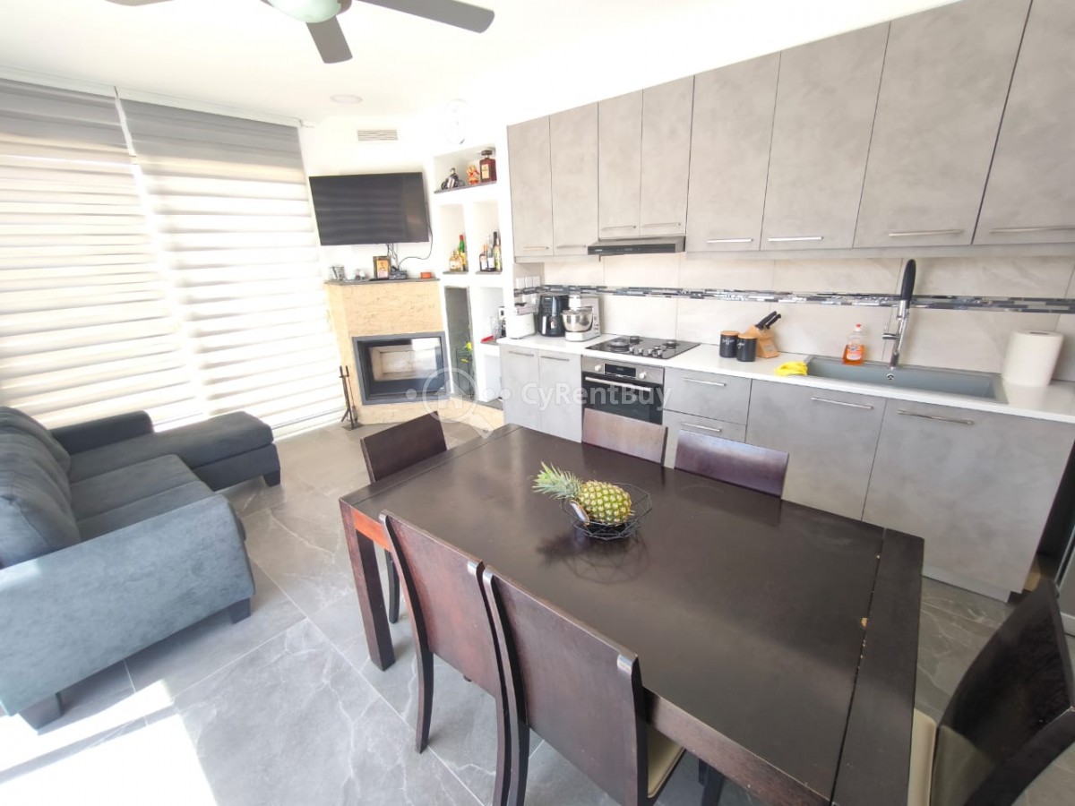 En el interior, encontrarás un gran salón con un televisor montado en la pared sobre una acogedora chimenea. La cocina abierta está completamente equipada y destaca por su elegante diseño en negro.