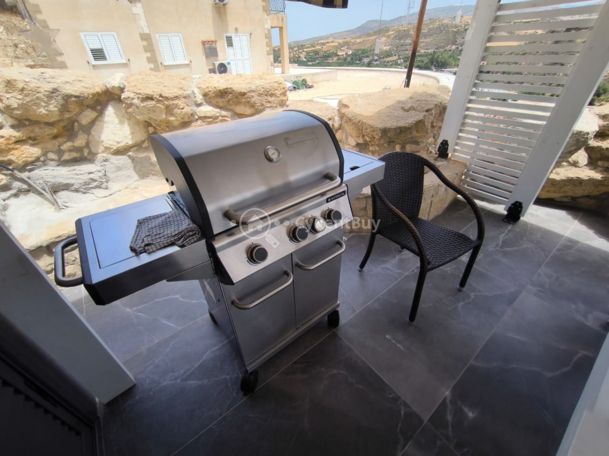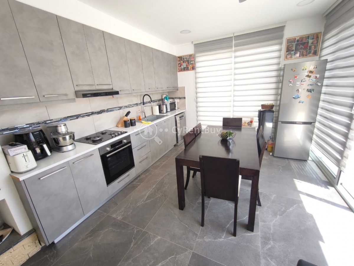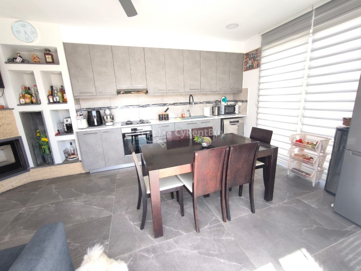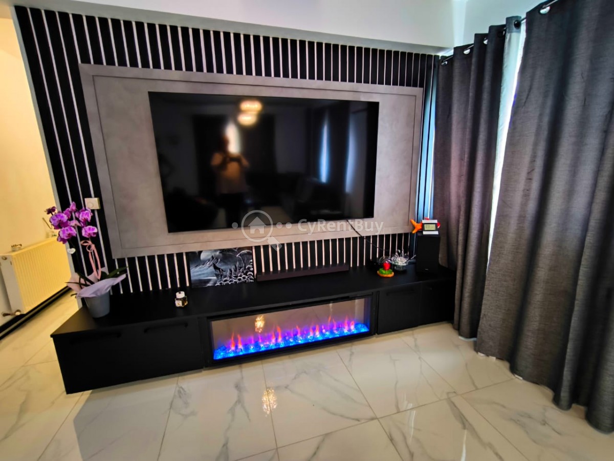 En el interior, encontrarás un gran salón con un televisor montado en la pared sobre una acogedora chimenea. La cocina abierta está completamente equipada y destaca por su elegante diseño en negro.