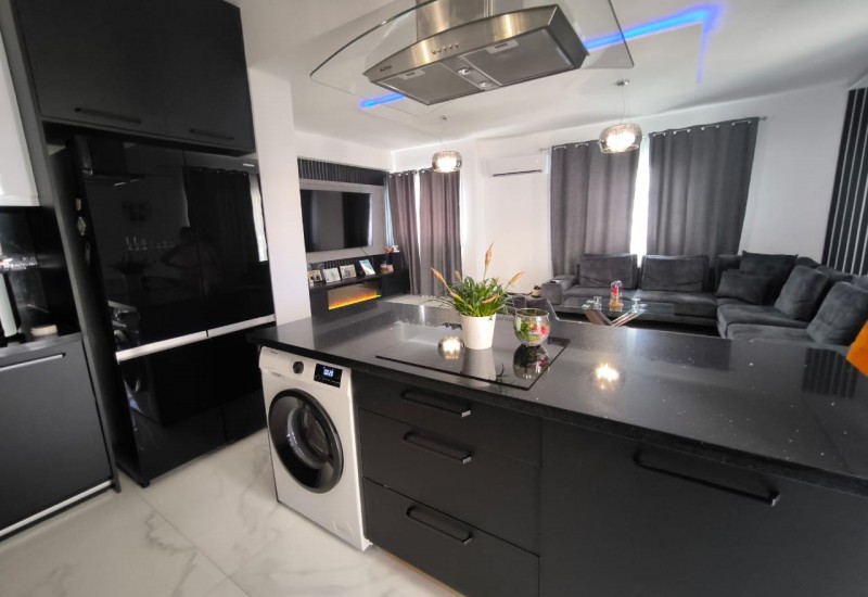 En el interior, encontrarás un gran salón con un televisor montado en la pared sobre una acogedora chimenea. La cocina abierta está completamente equipada y destaca por su elegante diseño en negro.