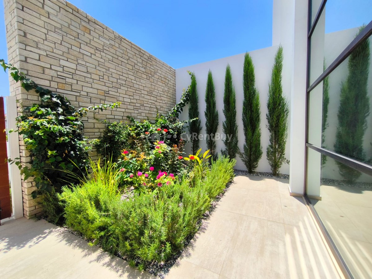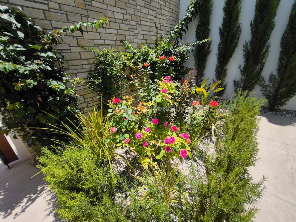 - Hermosos exteriores: La villa está rodeada por un jardín meticulosamente cuidado, con una piscina privada y césped soleado con tumbonas para tomar el sol y relajarse.