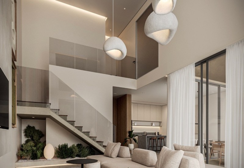 The villa features expansive open-plan interiors that flow effortlessly between living, dining, and kitchen areas, creating a seamless connection between indoor and outdoor living. Large openings and floor-to-ceiling windows allow natural light to fill the home, enhancing the sense of openness and comfort throughout.