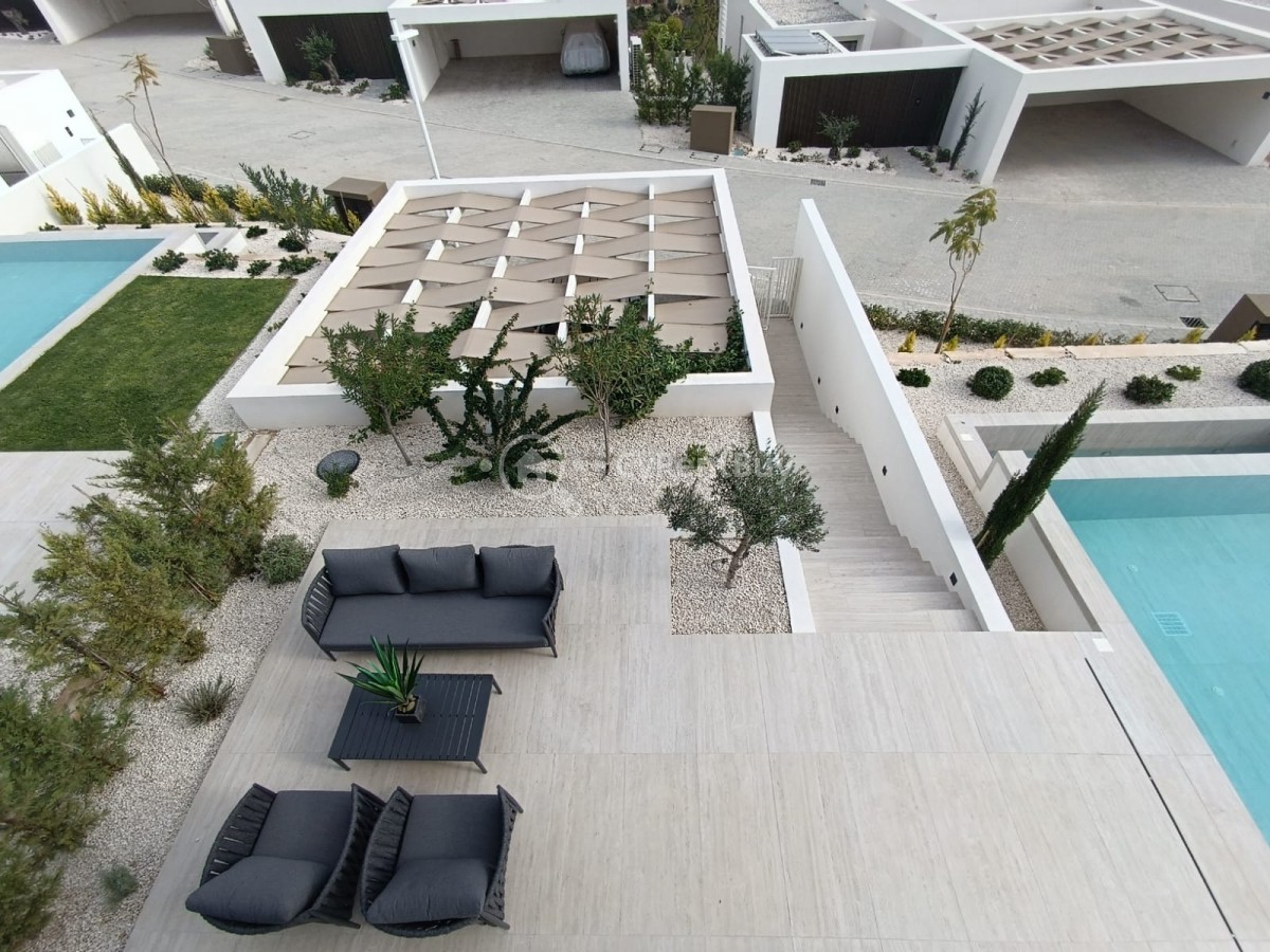 The villa’s exterior spaces are crafted to enhance Mediterranean living. A spectacular infinity-edge swimming pool blends into the horizon, surrounded by generous sun terraces finished with premium anti-slip stone-effect tiles. Landscaped gardens with mature planting create a sense of privacy and serenity, while a shaded BBQ area, outdoor shower and multiple lounging zones invite year-round enjoyment.