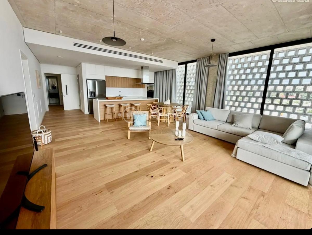 The apartment features a generous open-plan living, dining, and kitchen area, centered around a striking designer island. Premium finishes, natural materials, and full-height sliding glass doors create a seamless connection to the large covered verandas, perfectly framing the city skyline and Mediterranean Sea.